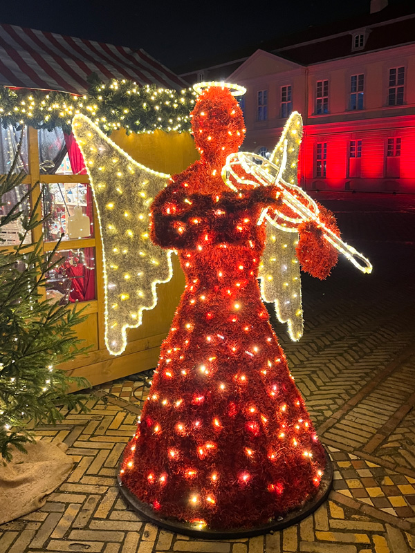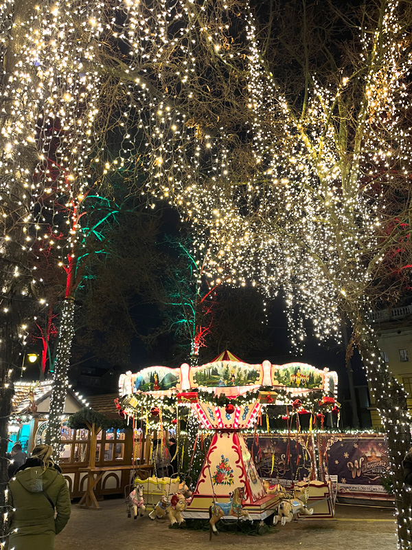 Das war mal was besonderes. Und ich sags euch, es gibt sie immer noch, die Geheimtips, sogar in Berlin. An einem bestimmten Adventswochenend, in Grunewald, die Buden um die Kirche rum, man spaziert immer im Kreis, mal hier ein Glühwein, mal da die heißen Maronen oder selbstgebackene Plätzchen (=Bredle). Weihnachtsschmuck, Kerzen, selbstgestrickte Mützen, Schmuck aus Tannenzapfen. Und plötzliche drei Weihnachtsmänner, auf Barhockern, jeder einen Sack vor sich. Sie spielen einarmiger Bandit, für ein Zehnerle darfst du einem den erhobene Arm runterdrücken, auf Kommando senken alle drei die Köpfe machen Pferdeschnaubgeräusche und holen was aus dem Sack. Eine Orange. Ein Lebkuchen. Ein Apfel. Wenn alle drei das gleiche Objekt herausgeholt haben, hast du gewonnen und bekommst: einen Kugelschreiber. Oder irgendein anderen Schmmarrn. Das ganze wird bei jeder Runde lustiger, denn die Weihnachtsmänner trinken auch gerne Glühwein und die Gesichter werden rot und das Jubilieren laut, wenn jemand gewonnen hat.